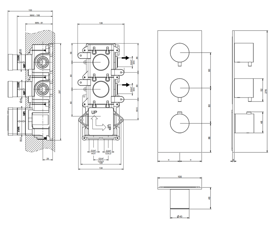 00229636 Built-in thermostatic high-capacity mixer with TWO SEPARATE EXITS